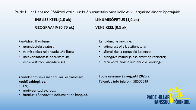 Uueks õppeaastaks otsitakse inglise keele, geograafia, liikumsiõpetuse ja vene keele õpetajat. Tööle asumise aeg on 25. august 2025. Avaldusi ja muid kandideerimiseks vajalikke dokumente oodatakse 1. maiks e-posti aadressil kool@paidepk.ee.